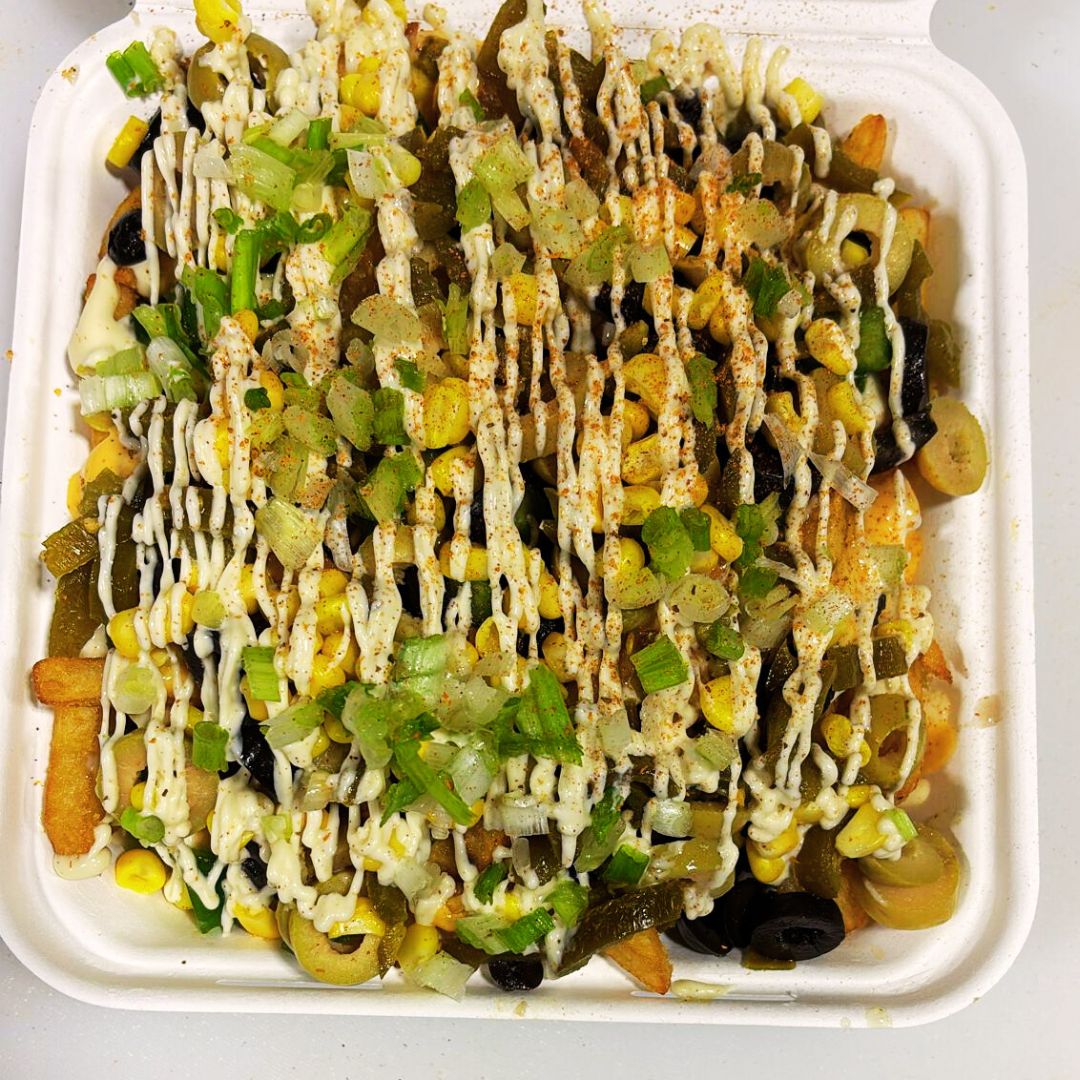 These fries are topped with olives, jalapeños, green peppers, sweet corn, green onion, and finished with creamy garlic sauce. Every bite gives you crunch, spice, and smooth flavour all at once. They are perfect for sharing or enjoying as a full meal on their own.
